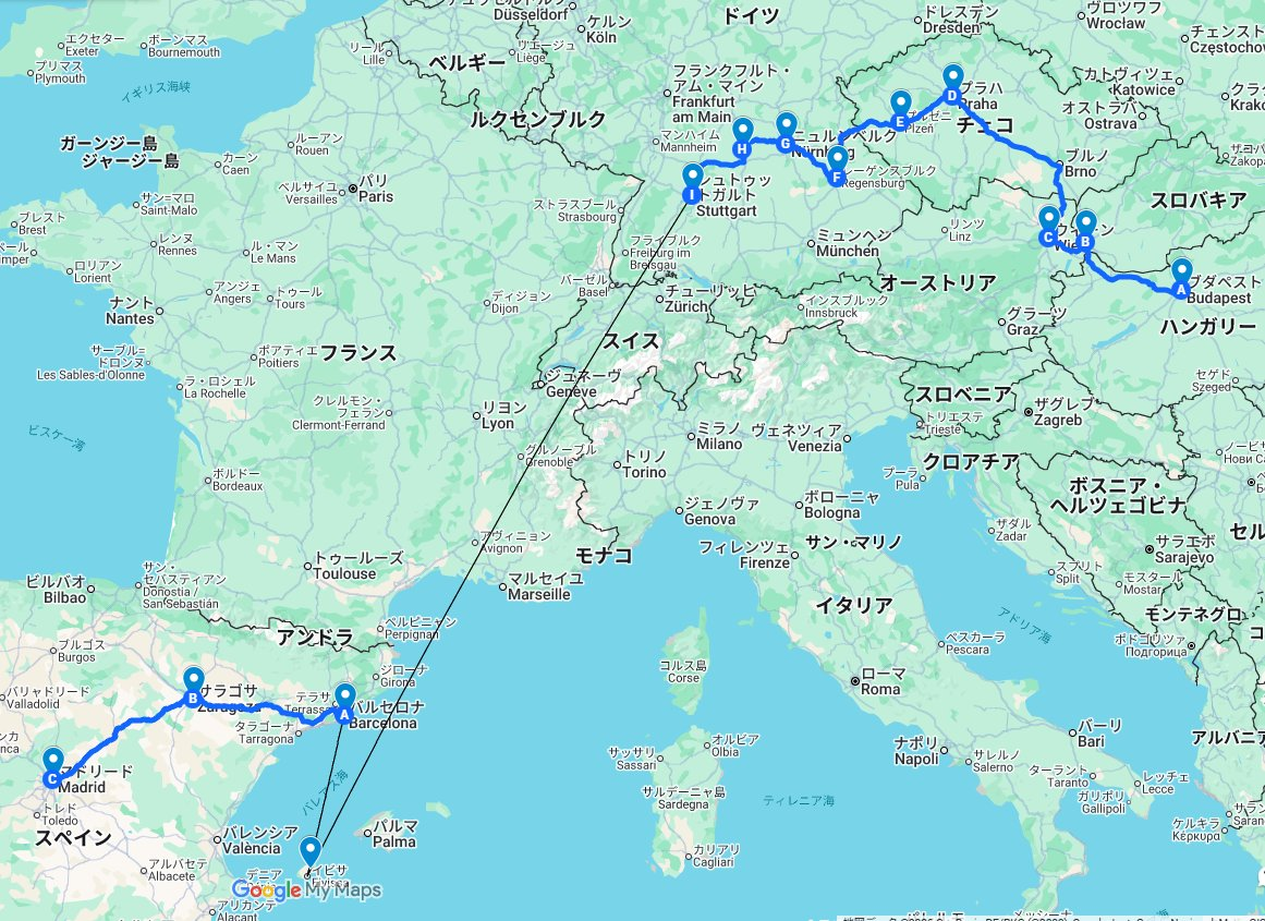 「中欧 → 南ドイツ → スペイン」というルートを辿りました。往路と復路で発着地が異なる、いわゆるオープンジョーといわれる旅程です。初手ヨーロッパ旅行の定番とされるフランス、スイス、イタリアを完全にすっ飛ばす逆張りっぷりです。
